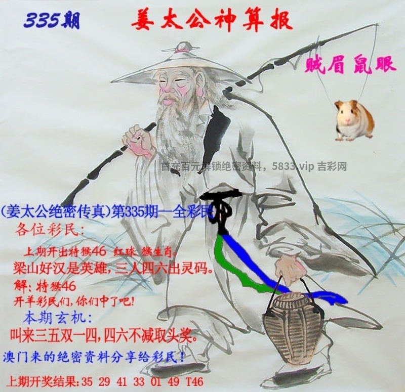 | 337期:济公特码诗 呈娇献嵋流动情,毒辣透顶性凶残。 解:猴鼠鸡龙虎猪。 活佛赠语:【快快活活】 解:龙马 七肖:猴鼠鸡龙虎猪马 五肖:猴鼠鸡龙虎 三肖:猴鼠鸡 |